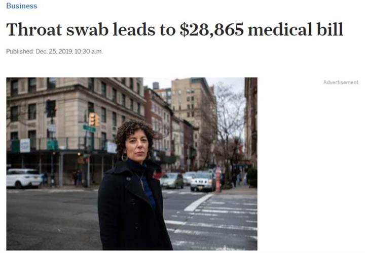 只是小检查 竟然收天价医疗费纽约居民艾雷莎‧卡斯丹(Alexa Kasdan),因为感冒导致喉咙发炎肿痛。过了一周嗓子仍不见好后预约医生检测。
