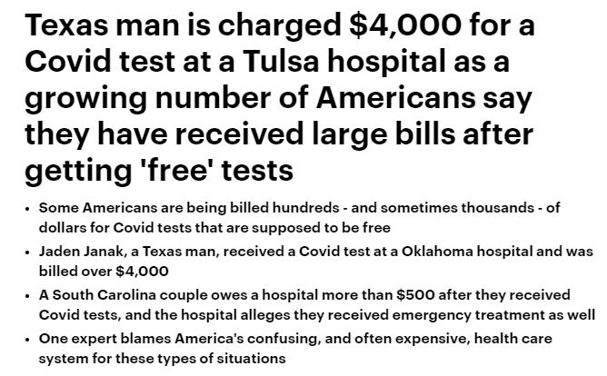 尽管根据法律规定,在大多数情况下,新冠检测费用应该是由保险公司全额覆盖的,但仍有一些人收到了大额且令人困惑的账单,少则数百,多则数千美元。贾纳克收到的第一份账单约为2700美元,包括急诊室和实验室费用。后来,他又收到了一份约1300美元的医疗费账单。