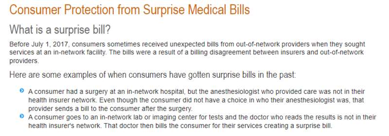 在任何情况下,禁止对使用保险覆盖范围内的医院设施,但是保险外的辅助护理(如麻醉师或助理外科医生)进行网络外收费。禁止在没有事先通知的情况下收取其他保险网络外费用。医疗服务提供者必须向病人提供一份通俗易懂的通知,说明在保险网络外接受治疗需要病人的同意,然后该服务提供者才能按较高的网络外收费标准收费。解决意外账单问题至关重要,因为它往往会给个人及其家庭带来毁灭性的经济后果。在美国所有破产申请中,三分之二都与医疗费用有关。