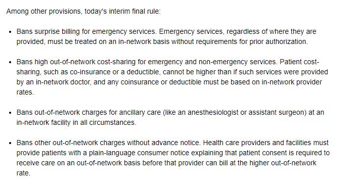 禁止对Emergency紧急服务收取Surprise medical bill意外费用,无论在何处提供紧急服务,都必须在保险网络内处理,无需事先获得授权。禁止对急诊和非急诊服务进行高额的out-of-network高额保险网络外成本分摊。患者需要支付的费用,不能高于由保险网络内医生提供的服务的费用,并且任何自付额(Deductible)必须基于保险网络内医生的费率。