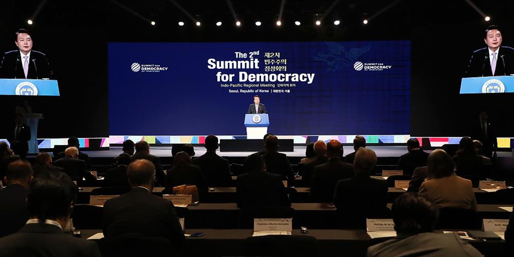 当地时间2023年3月30日,韩国首尔,韩国总统尹锡悦出席第二届民主峰会开幕式,并发表欢迎词。视觉中国 图