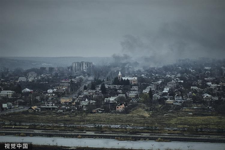 当地时间2023年3月26日,顿涅茨克地区,乌克兰军队与俄罗斯军队激战的巴赫穆特,烟雾从建筑物中升起。 本文图均为 视觉中国 图