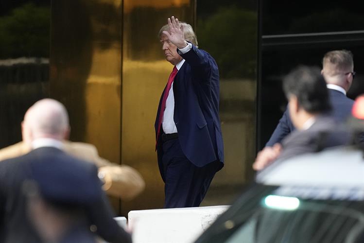 当地时间4日下午,在特勤局特工的保护下,穿着标志性的蓝西装、戴着红领带的特朗普从位于纽约的特朗普大厦被护送到曼哈顿地区法院进行指纹采集。他在下车后走向法院大楼时向车队后方挥手致意。针对特朗普的问讯从当地时间14时15分开始。