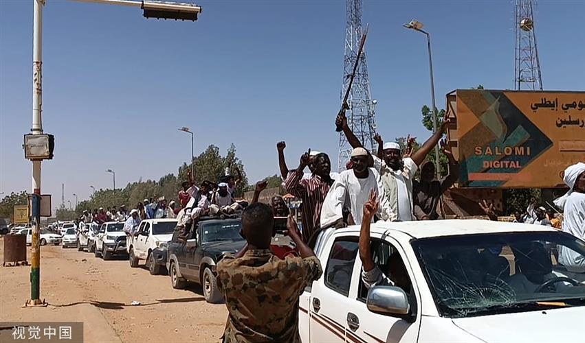 当地时间2023年4月18日,苏丹Shendi,忠于苏丹武装部队总司令阿卜杜勒·法塔赫·阿卜杜勒-拉赫曼·布尔汉的士兵在占领对手快速支援部队的军事基地后庆祝。本文图片 视觉中国 图