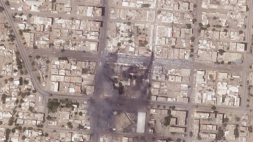 当地时间2023年4月18日,苏丹喀土穆,喀土穆北部商业区大火和被毁的市场摊位的卫星图像。