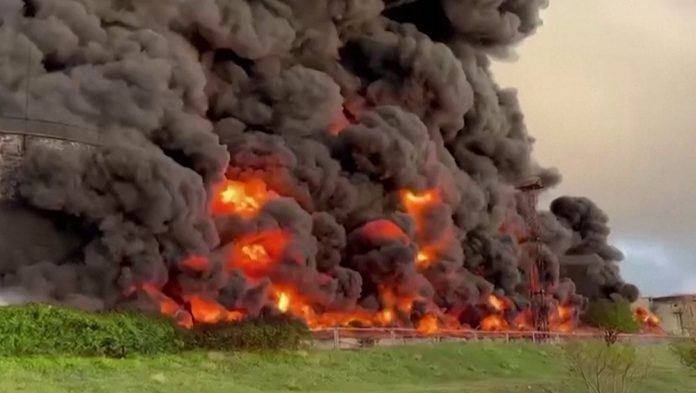 影片截图显示,克里米亚储油厂发生大火,遭烈焰吞噬。AP/路透