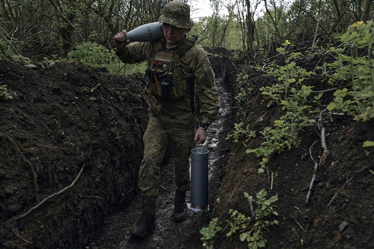 当地时间2023年4月29日,顿涅茨克地区巴赫穆特附近,一名乌克兰士兵在战壕里搬运炮弹。视觉中国 图