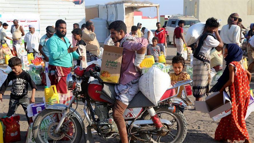 当地时间2023年4月20日,也门荷台达,流离失所的人们在一个难民营接受粮食援助。视觉中国 图