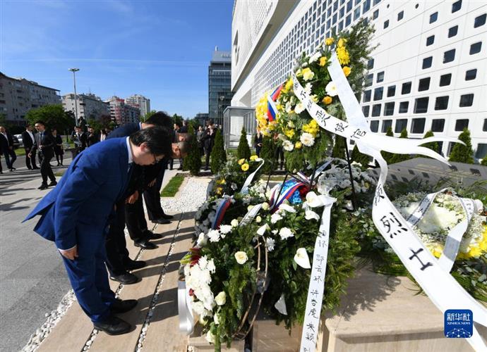 5月7日,在塞尔维亚贝尔格莱德,中资企业代表向中国驻南斯拉夫联盟大使馆旧址前的烈士纪念碑鞠躬。新华社记者 任鹏飞 摄