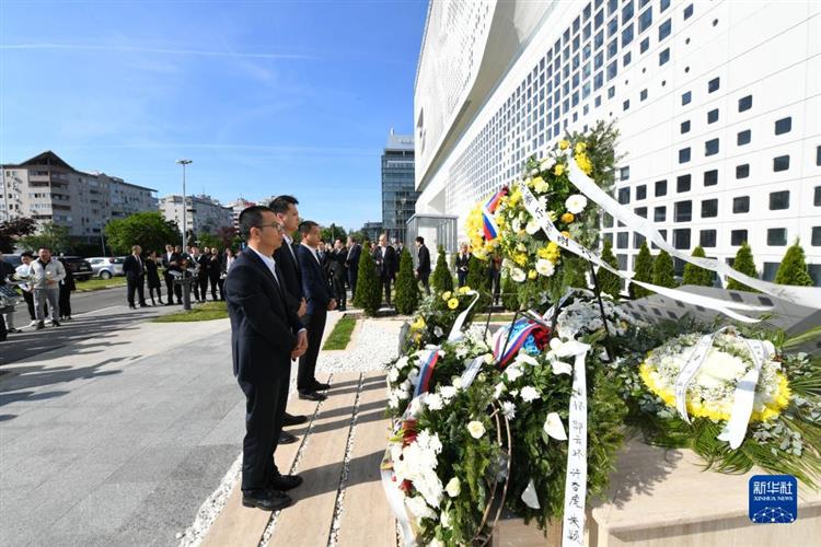 5月7日,在塞尔维亚贝尔格莱德,中资企业代表在中国驻南斯拉夫联盟大使馆旧址前的烈士纪念碑前肃立。新华社记者 任鹏飞 摄