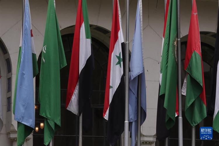 这是5月7日在位于埃及开罗的阿拉伯国家联盟总部拍摄的叙利亚国旗(左四)。新华社发(艾哈迈德·戈马 摄)