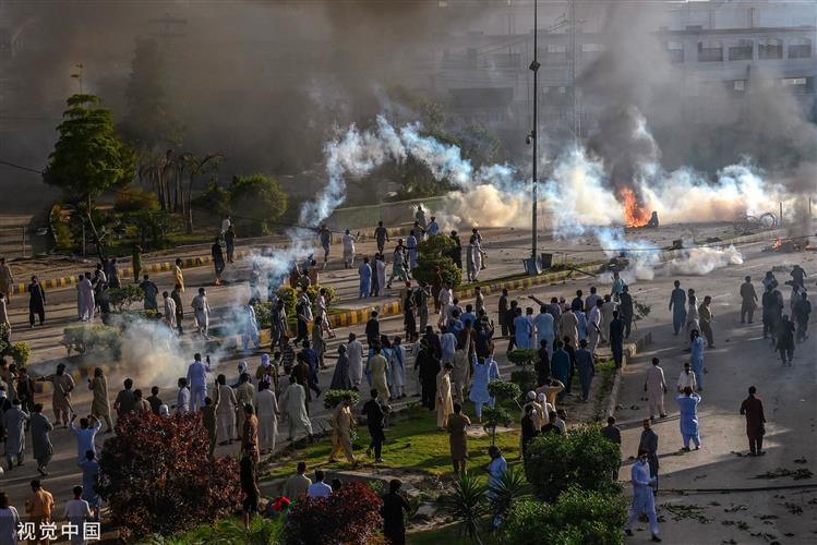 当地时间2023年5月9日,巴基斯坦白沙瓦,巴基斯坦前总理、正义运动党主席伊姆兰·汗被逮捕,其支持者举行抗议,警方向他们发射催泪弹驱散人群。