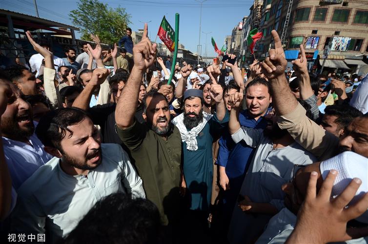 当地时间2023年5月9日,巴基斯坦白沙瓦,巴基斯坦前总理伊姆兰·汗的支持者聚集在一起抗议他们的领导人被捕。