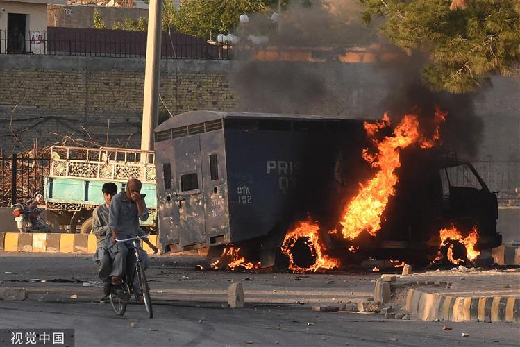 当地时间2023年5月9日,巴基斯坦奎达,巴基斯坦前总理伊姆兰·汗的支持者聚集在一起抗议他们的领导人被捕,抗议者骑着自行车经过一辆燃烧的警车。
