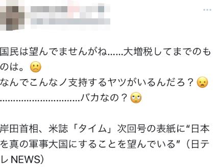 也有网友分析称,“美国希望日本成为军事大国。岸田是世界上最容易受美国影响的领导人之一。作为奖赏,美国让岸田上了《时代》周刊封面,告诉他要‘再接再厉’”。