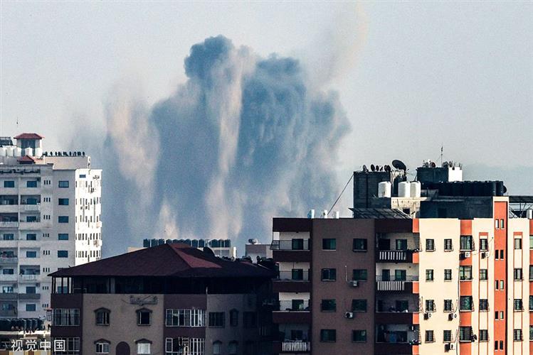 当地时间2023年5月11日,加沙城,以色列发动空袭后,加沙城的建筑物上空升起烟雾。人民视觉 图