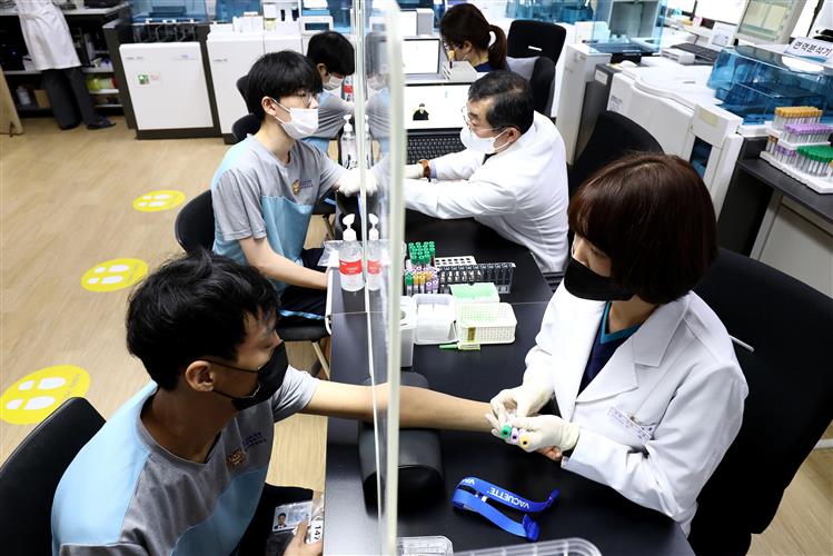 当地时间2023年2月1日,韩国首尔,军事人力资源管理局,青少年在征兵体检期间接受血液测试。 视觉中国 图