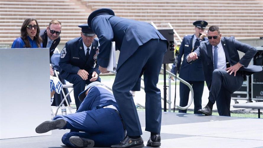 当地时间2023年6月1日,美国科罗拉多,美国总统拜登在出席美国空军学院毕业典礼时摔倒。 视觉中国 图