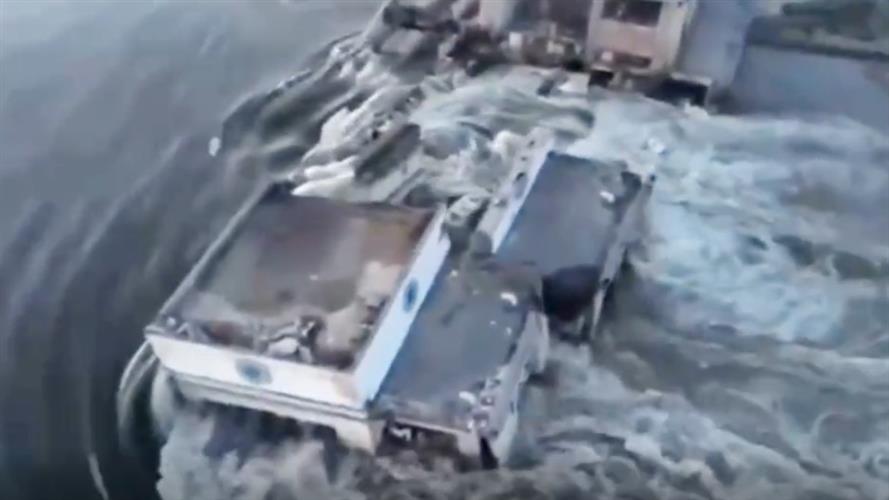 卡霍夫卡水电站大坝持续坍塌。视频截图
