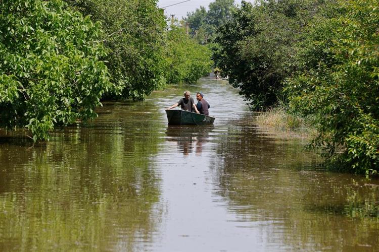 6月8日,人们乘船经过赫尔松州被洪水淹没的地区。(新华社发 维克托摄)