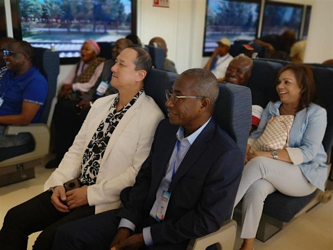 6月13日,非洲国家驻华使节在中车南京浦镇车辆有限公司展厅体验“坐动车”。 新华社记者 陆华东 摄