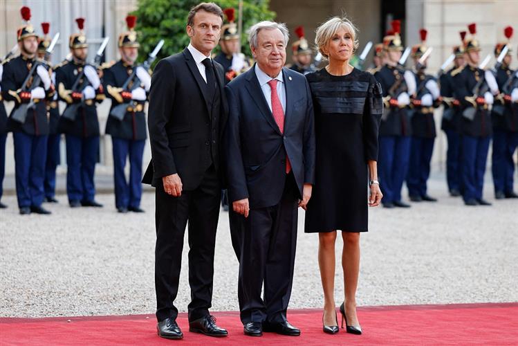 当地时间2023年6月22日,法国巴黎,法国总统马克龙(左)和夫人布丽吉特·马克龙(右)欢迎联合国秘书长安东尼奥·古特雷斯(中)抵达爱丽舍宫,参加新全球融资契约峰会期间的正式晚宴。视觉中国 图