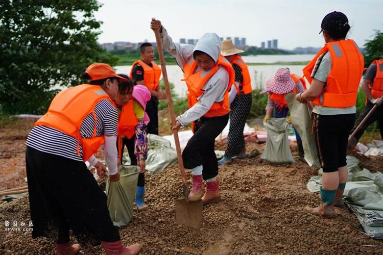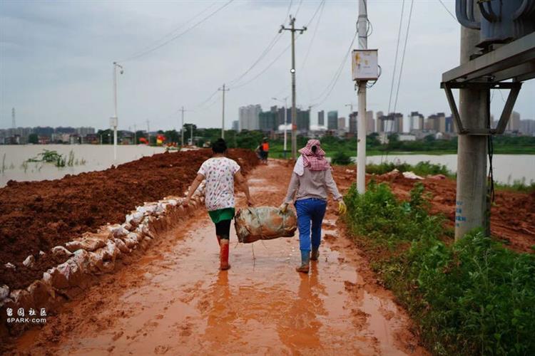 广场舞大妈也没心思跳舞了,一群平均年龄超过五十岁的阿姨们,组成了抗洪“阿姨团”。