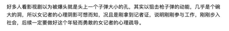 她巧妙又不露痕迹地周旋,故意拖延时间,让歹徒放松警惕,给警方击毙歹徒创造了机会。不怕是不可能的。明晃晃的刀就在眼前,一个动作触怒歹徒,孩子就有危险,自己也会面临生命危险。可在最危机那一刻,她还是按捺住心头的恐惧,勇敢走上前,直面邪恶和歹毒。枪声响起,女记者直面目睹了歹徒被爆头的整个过程。那一瞬间,她跌跌撞撞往台阶下跑,在别人的搀扶下,双腿发抖,身子一下子瘫软。