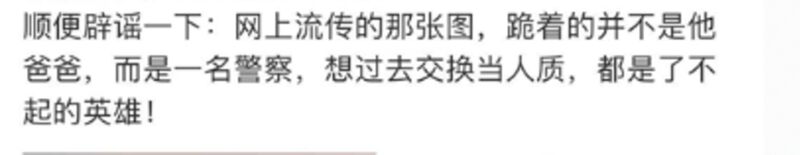 在人质被劫持的现场,有一张男子下跪的背影照。最开始,很多人传,这是被劫持少年的爸爸下跪,请求放过孩子。