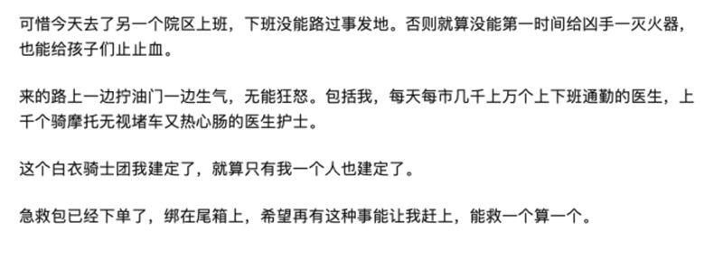 在受伤孩子抢救的过程中,医院的医生,包括后勤行政的人员,都自发集中在急诊室门口,即使深夜也依旧守候。警察、老师、医生,他们在自己的岗位,已经做到了最好。他们联合起来,保护这些孩子们,把伤害降到最低。可他们还是觉得自己做得不够,为自己没能救回孩子的生命,为那些无辜受伤的孩子而心碎。有人丧心病狂挥刀砍向无辜的孩子,就有人不惜一切代价,把孩子们庇护在自己身后。人与人的高尚与卑劣,高下立现。真正的英雄,一直都尽职尽责地在自己的岗位上。对他们,唯有最崇高的敬意。