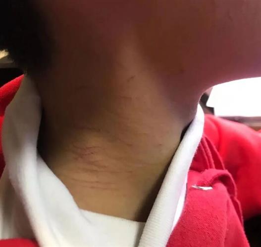 被劫持孩子的父亲称,事件发生后怕孩子做噩梦,昨晚守了孩子一夜,精神状态尚可,从孩子表姐拍摄的照片来看,孩子脖子上有数道划痕,但伤口都不深,家属表示“孩子说一点也不怕那些劫匪,只想快点恢复正常生活”。