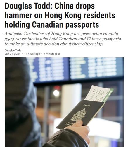 香港750万人中居住了不少持有外国护照的人士,其中持有美国护照的10万人,持澳洲护照的8.5万人,持加拿大护照的35万人,也是最大持有外国护照群体。加拿大移民律师Sam Hyman和David Lesperance指出,许多持有加拿大护照的人住在香港,因为他们可以在世界金融中心的香港赚更多的钱,而不必缴纳加拿大较高的个人收入所得税。Sam Hyman表示,中国政府基本上就等于在说,如果你想继续在香港生活和工作,就必须二选一。