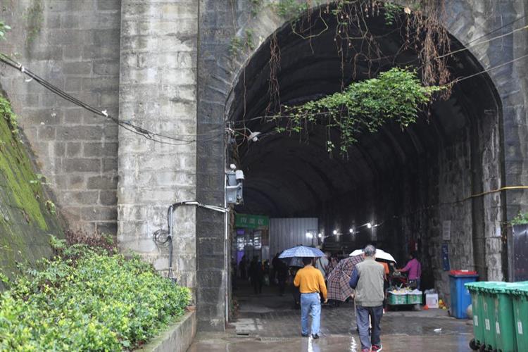 这条隧道修建于20世纪60年代,曾是重庆特钢厂运输钢材专线铁路的隧道。去年,沙坪坝区石井坡街道和平山社区大河沟菜市场拆旧建新,新菜市场建成前,这条废弃隧道被改建成临时菜市场,方便了周边4000余户居民买菜,当地群众亲切地称之为“洞子菜市”。