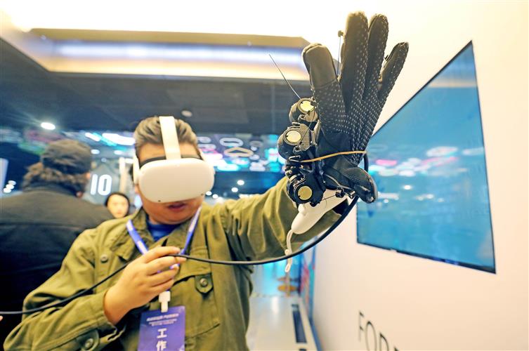 2023年3月21日,杭州,观众在中国虚拟现实与元宇宙产业峰会上体验人机交互触觉手套。IC 图