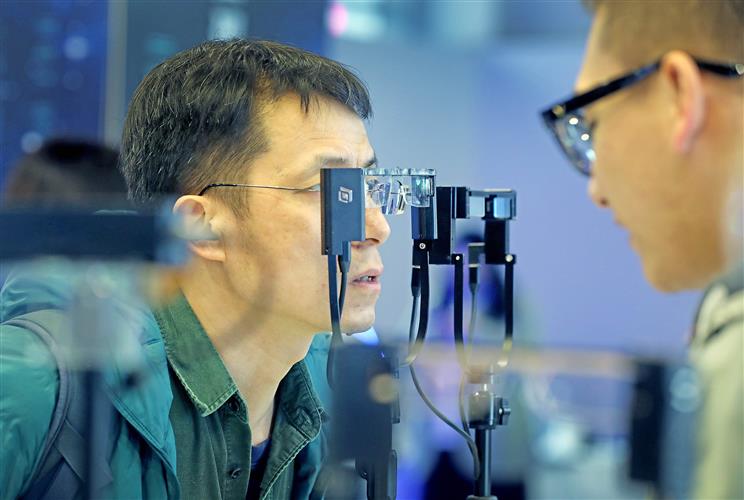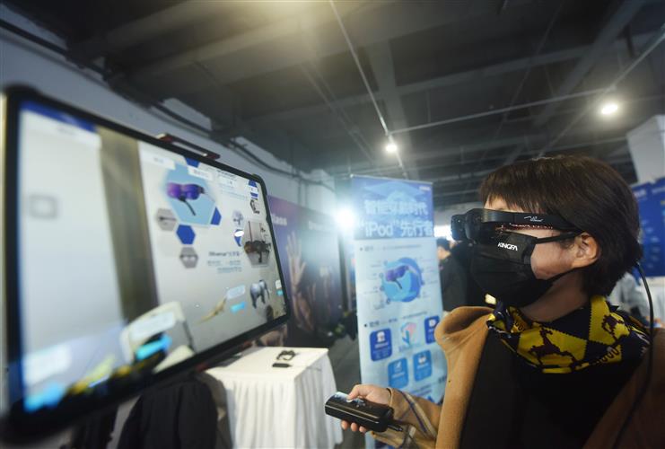 2023年3月21日,杭州,观众在中国虚拟现实与元宇宙产业峰会上体验WGlasses智能眼镜。IC 图