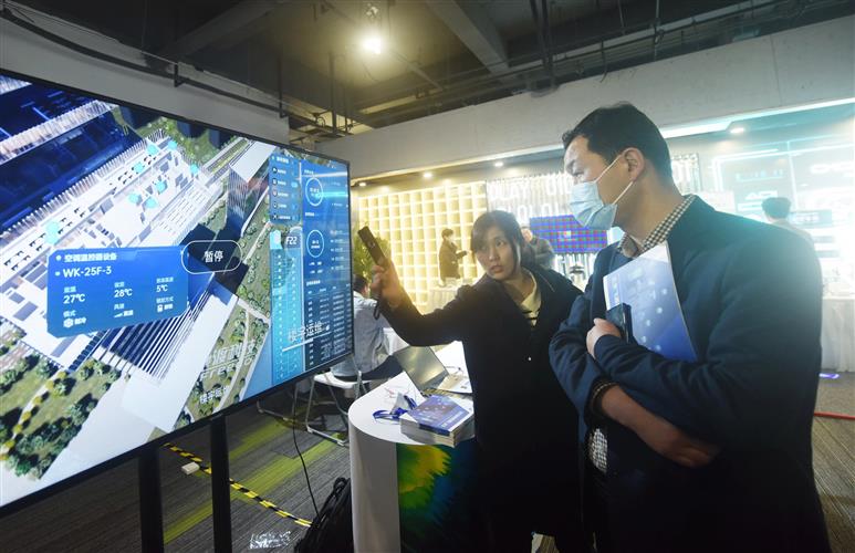 2023年3月21日,杭州,观众在中国虚拟现实与元宇宙产业峰会上了解工业数字孪生平台。IC 图