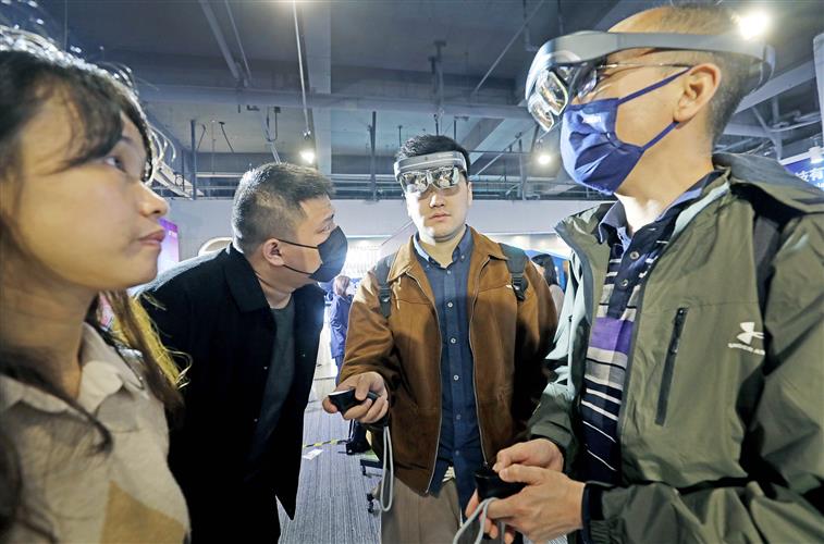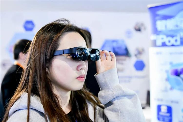 2023年3月21日,杭州,观众在中国虚拟现实与元宇宙产业峰会上体验WGlasses智能眼镜。美丽西湖公众号 图