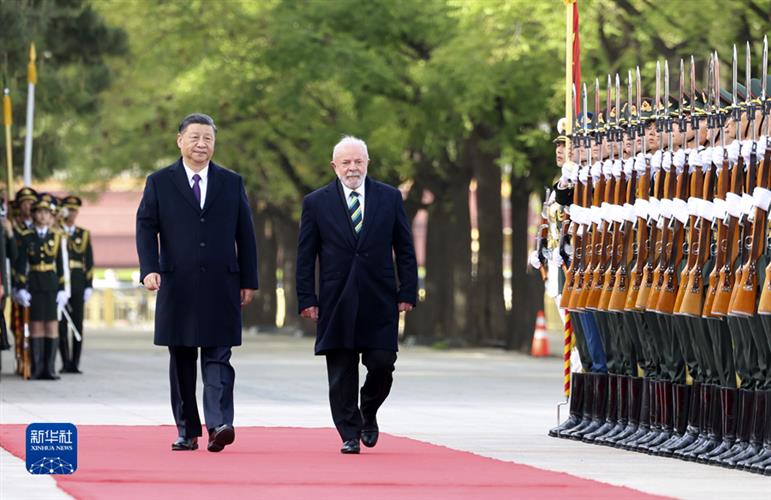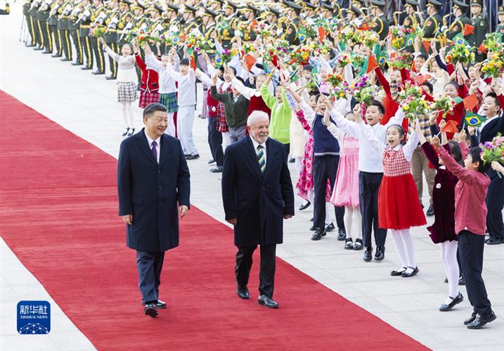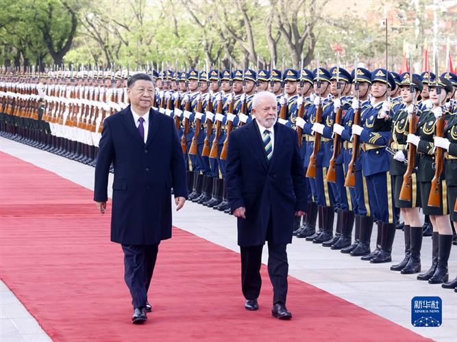 4月14日下午,国家主席习近平在北京人民大会堂同来华进行国事访问的巴西总统卢拉举行会谈。这是会谈前,习近平在人民大会堂东门外广场为卢拉举行欢迎仪式。 新华社记者 黄敬文 摄