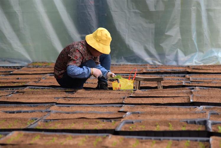 2月28日,村民在定西现代丝路寒旱农业综合示范园区移栽马铃薯脱毒种苗。新华社记者王朋 摄