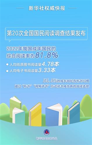 新华社杭州4月23日电,你有读书的习惯吗?过去一年,你读了几本书?23日在杭州开幕的第二届全民阅读大会上,发布第20次全国国民阅读调查结果。调查发现,2022年我国成年国民包括书报刊和数字出版物在内的各种媒介的综合阅读率为81.8%,保持增长态势。