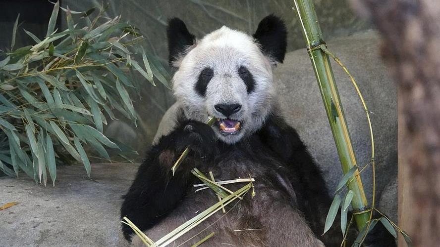 当地时间2023年4月8日,美国田纳西州,孟菲斯动物园,大熊猫“丫丫”正在吃竹子。视觉中国 资料图
