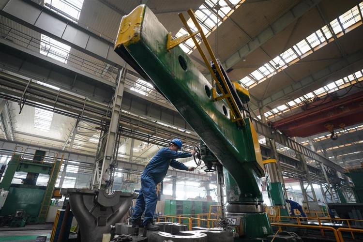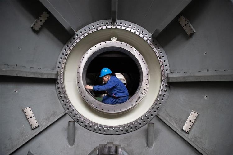 4月28日,工人在哈电集团哈尔滨汽轮机厂有限责任公司车间内生产作业。新华社记者 张涛 摄