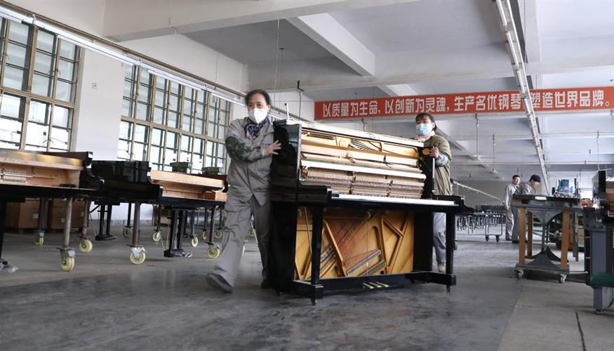 2月21日,工人在东北钢琴乐器有限公司车间内推运钢琴组件,赶制外贸订单。新华社记者 姚剑锋 摄