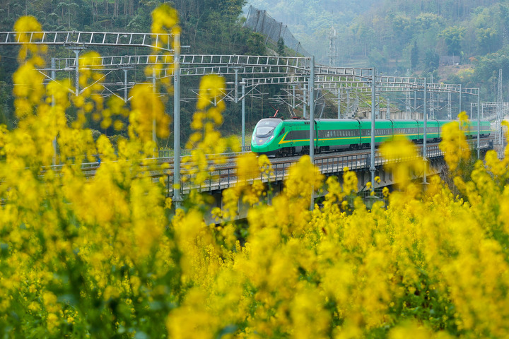 3月10日,复兴号动车组开行在新成昆铁路上,铁路附近的油菜花吐露芬芳。新华社记者 沈伯韩 摄
