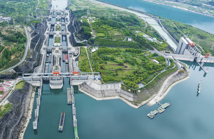 4月24日,船舶有序通过三峡双线五级船闸(无人机照片)。新华社发(郑家裕 摄)