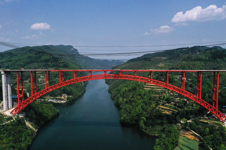4月11日拍摄的贵州德余高速乌江特大桥建设现场(无人机照片)。新华社记者 杨文斌 摄