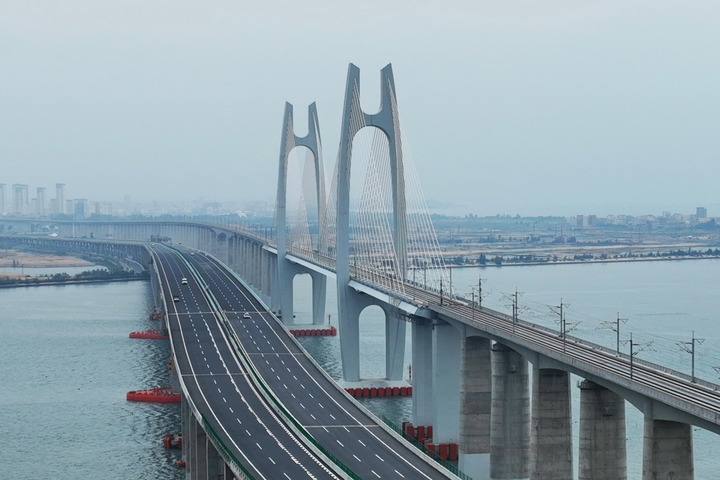 4月12日拍摄的新建福厦铁路安海湾跨海大桥(右)(无人机照片)。新华社记者 林善传 摄