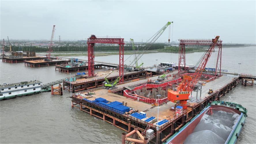4月20日,张靖皋长江大桥南航道桥辅塔施工现场。新华社发(俞春生 摄)