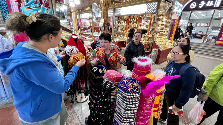 4月24日,新疆国际大巴扎景区商家给游客介绍维吾尔族花帽。新华社记者周晔 摄