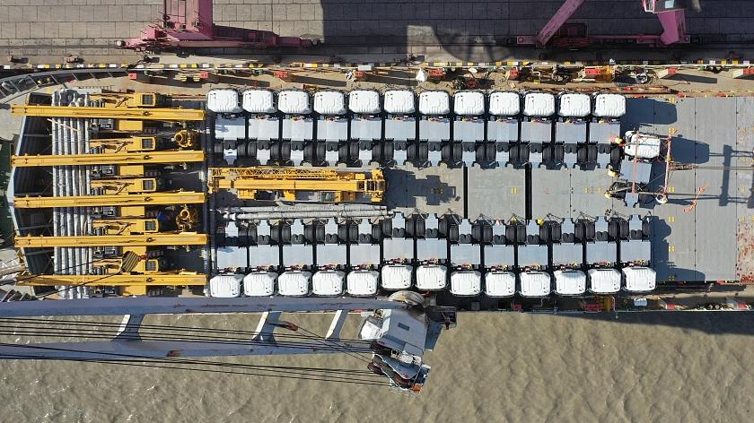 2022年12月14日,上海港张华浜码头,40辆比亚迪纯电动卡车经过吴淞海关核验后,装上“青浦”号散货船。视觉中国 资料图